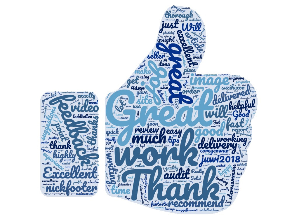 Here's a word cloud based on my last 12 months of Fiverr reviews: