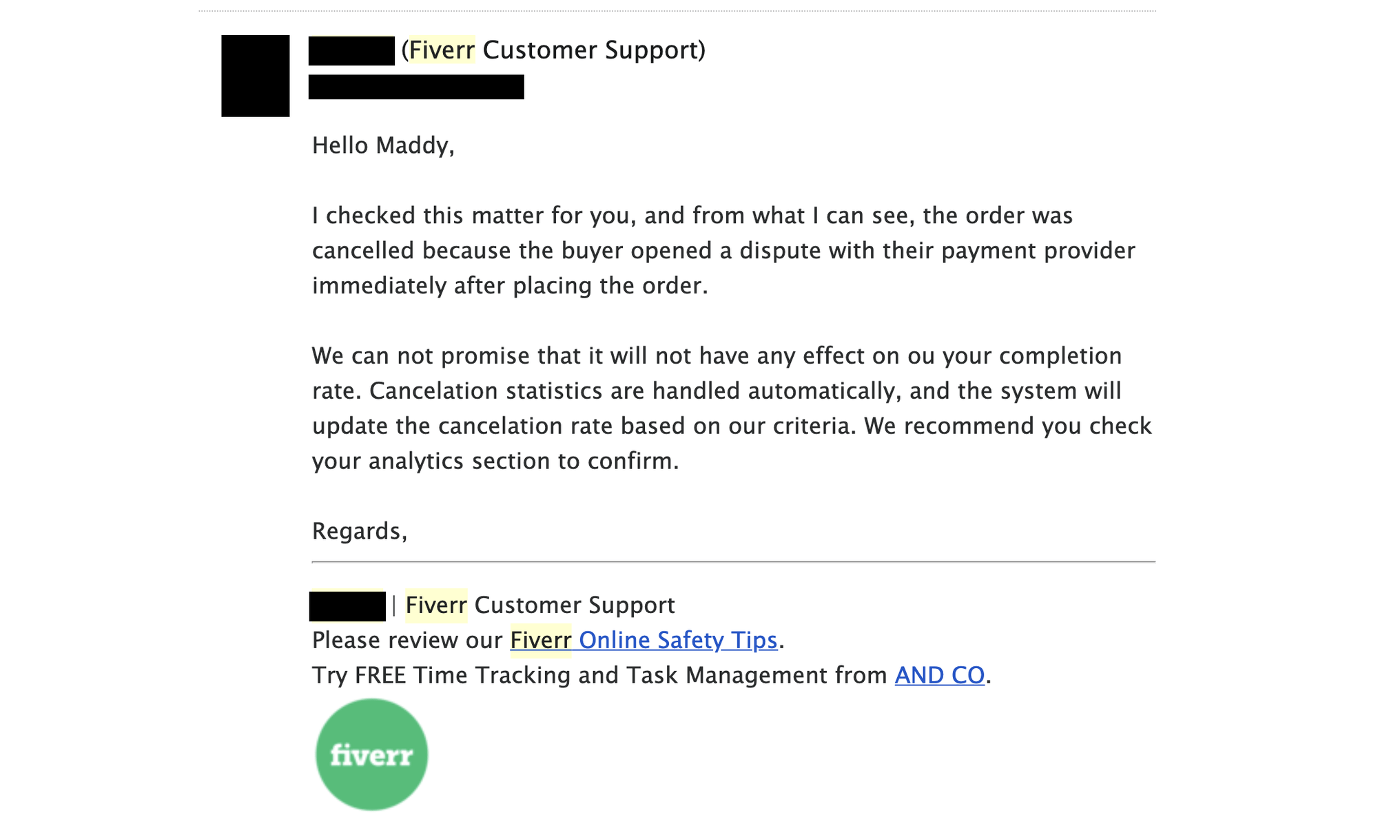 Trust me when I say that it's just not worth the fight, especially over a small order value. At this point in time, Fiverr cares more about the customer than they care about you — and they probably always will.